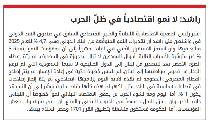 أما اليوم ووسط الغموض المخيّم على ما ستؤول اليه الحرب والفترة التي ستستغرقها وما إذا كان لبنان سيبقى بمنأى عنها، فماذا سيكون مصير اقتصاد لبنان والنموّ المتوقّع في نهاية العام؟