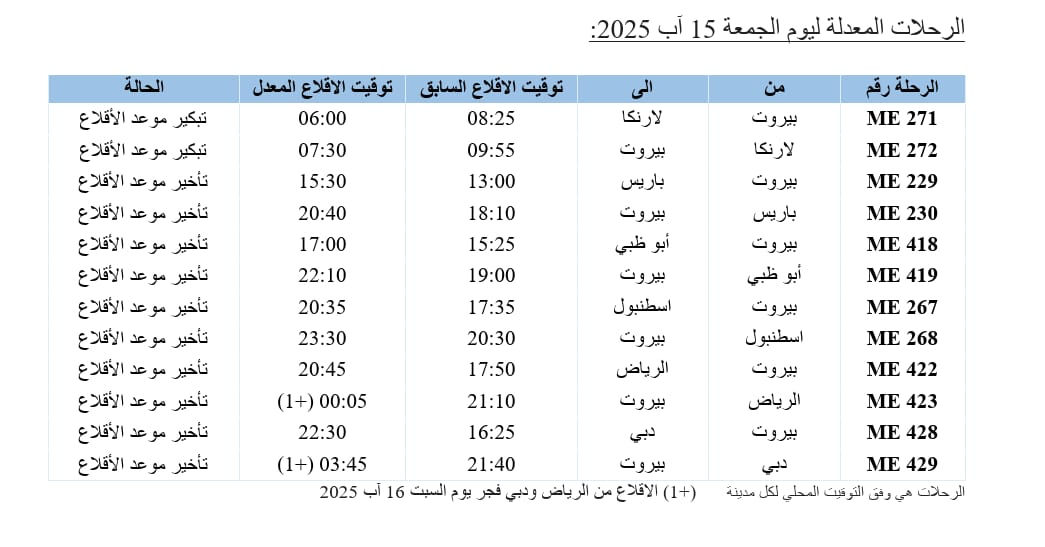 أ) الغاء رحلة العودة دبي – بيروت المسائية المجدولة ليوم الجمعة 15 آب 2025 تحت رقم ME429 (موعد اقلاعها كان 21:40) بحيث سيتم تحويل الركاب على الرحلة ME431 التي تقلع من دبي 02:15 فجر السبت 16 آب 2025 . يمكن للركاب تغيير حجزهم مجاناً لمرة واحدة على متن طائرات الشركة حصراً في نفس المقصورة من خلال إما تقديم موعد الحجز أو تأخيره.