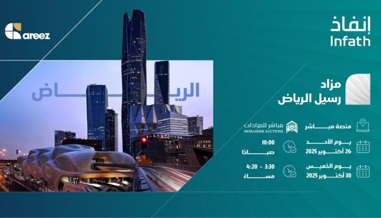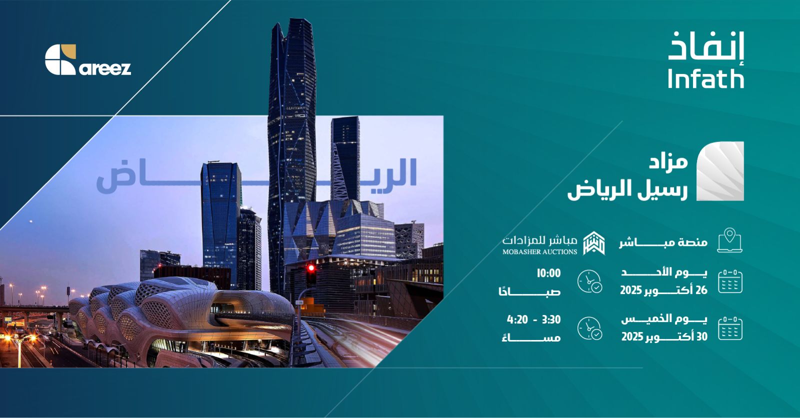 تعلن شركة أريز للاستثمار التجاري وبإشراف مركز الإسناد والتصفية «إنفاذ» وبقرار من محكمة التنفيذ، عن إقامة مزاد «رسيل الرياض»، وذلك يوم الأحد 26 أكتوبر 2025 في العاشرة صباحًا، وينتهي يوم الخميس 30 أكتوبر 2025 في الساعة الثالثة والنصف وحتى الرابعة وعشرون دقيقة مساءً، إلكترونيًا عبر منصة مباشر للمزادات.