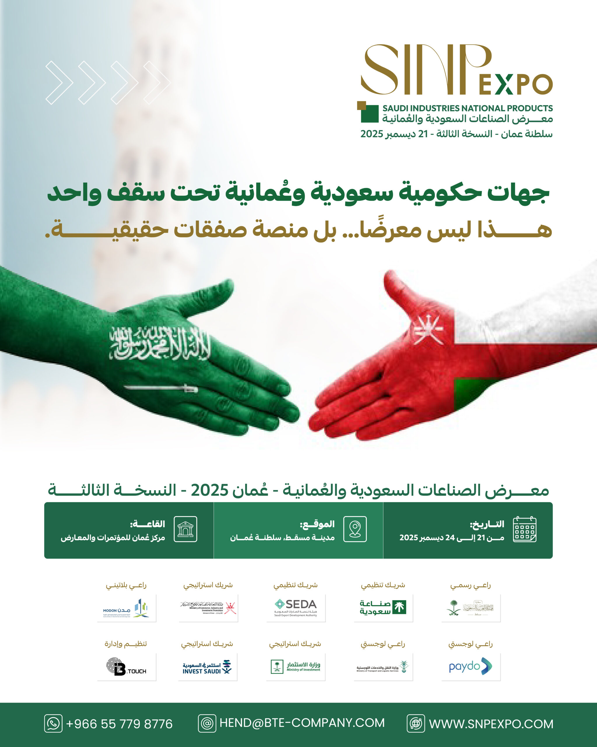 “SINP Expo هو منصة صناعية ولوجستية خليجية مشتركة، تجمع المصانع والمستثمرين والمناطق الحرة تحت سقف واحد، لصنع فرص حقيقية وتفعيل التبادل التجاري بين السعودية وعمان.”
