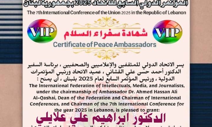 في محطة متميزة ومشرّفة تضاف إلى سجلّه المهني والإنساني، نال الدكتور إبراهيم علي علايلي شهادة سفير سلام دولي، خلال أعمال المؤتمر الدولي السابع للاتحاد الدولي للمثقفين والإعلاميين والصحفيين لعام 2025، الذي انعقد في الجمهورية اللبنانية، بمشاركة نخبة من المفكرين والإعلاميين والأكاديميين والخبراء الدوليين.
