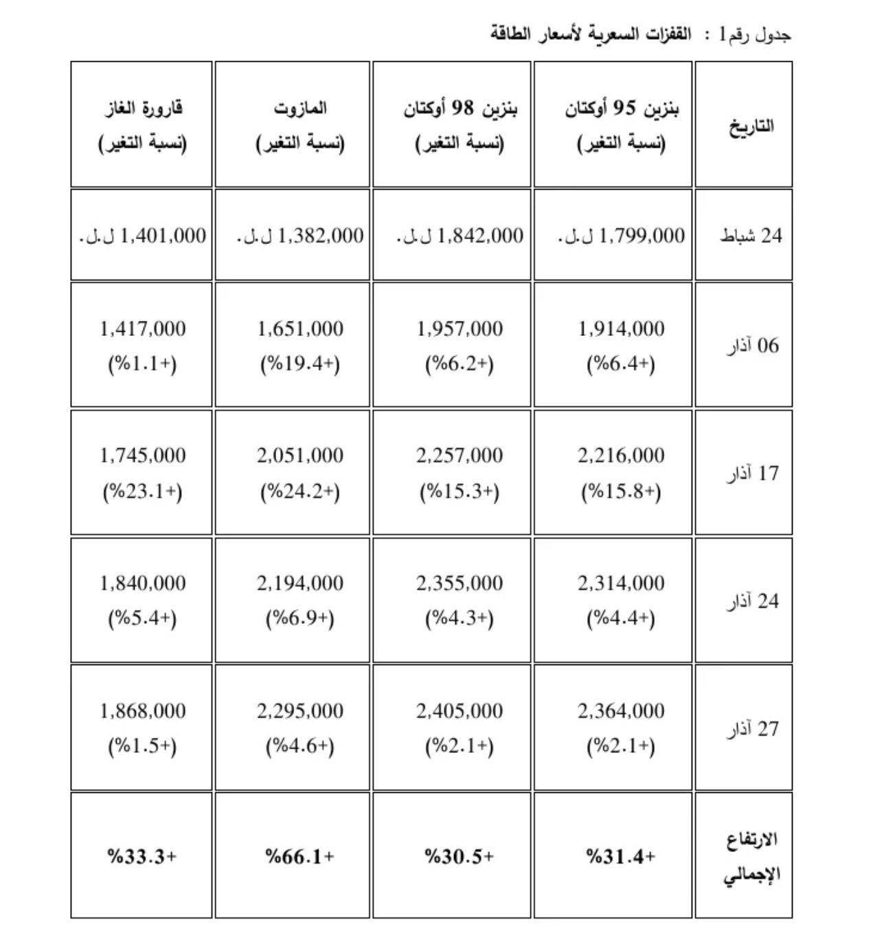 تُظهر الأرقام (جدول رقم 1) الفروقات بين معدلات ارتفاع البنزين والمازوت والغاز، بحيث أن الأزمة لم تعد محصورة في التكاليف الفردية والعائلية، بل امتدت إلى قلب الدورة الإنتاجية، وإلى الخدمات الأساسية المرتبطة بالطاقة المنزلية والتشغيل الصناعي.